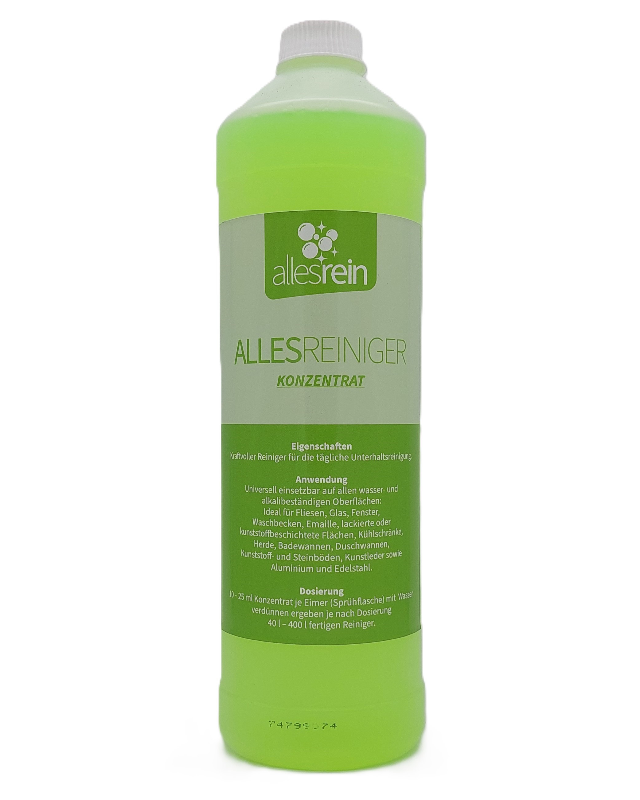 Eigenschaften: Der Allesreiniger ist ein Kraftvoller Reiniger für die Tägliche Unterhaltsreinigung. Anwendung: Allesrein kann universell für alle wasser und alkalibeständigen Materialien eingesetzt werden: Für Kacheln, Fliesen, Glas, Fenster, Waschbecken, Emaille, kunststoffbeschichtete oder lackierte Oberflächen, Kühlschränke, Herde, Bade und Duschwannen, Kunststoff- und Steinfußböden, Kunstleder usw. Auch für Aluminium und Edelstahl geeignet. Dosierung: 10 ml bis 25 ml auf 1 l Wasser empfohlen und ergibt je nach Dosierung 40 l bis 80l fertigen Reiniger.
